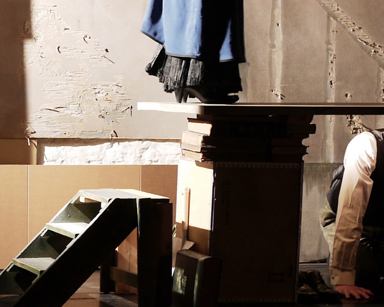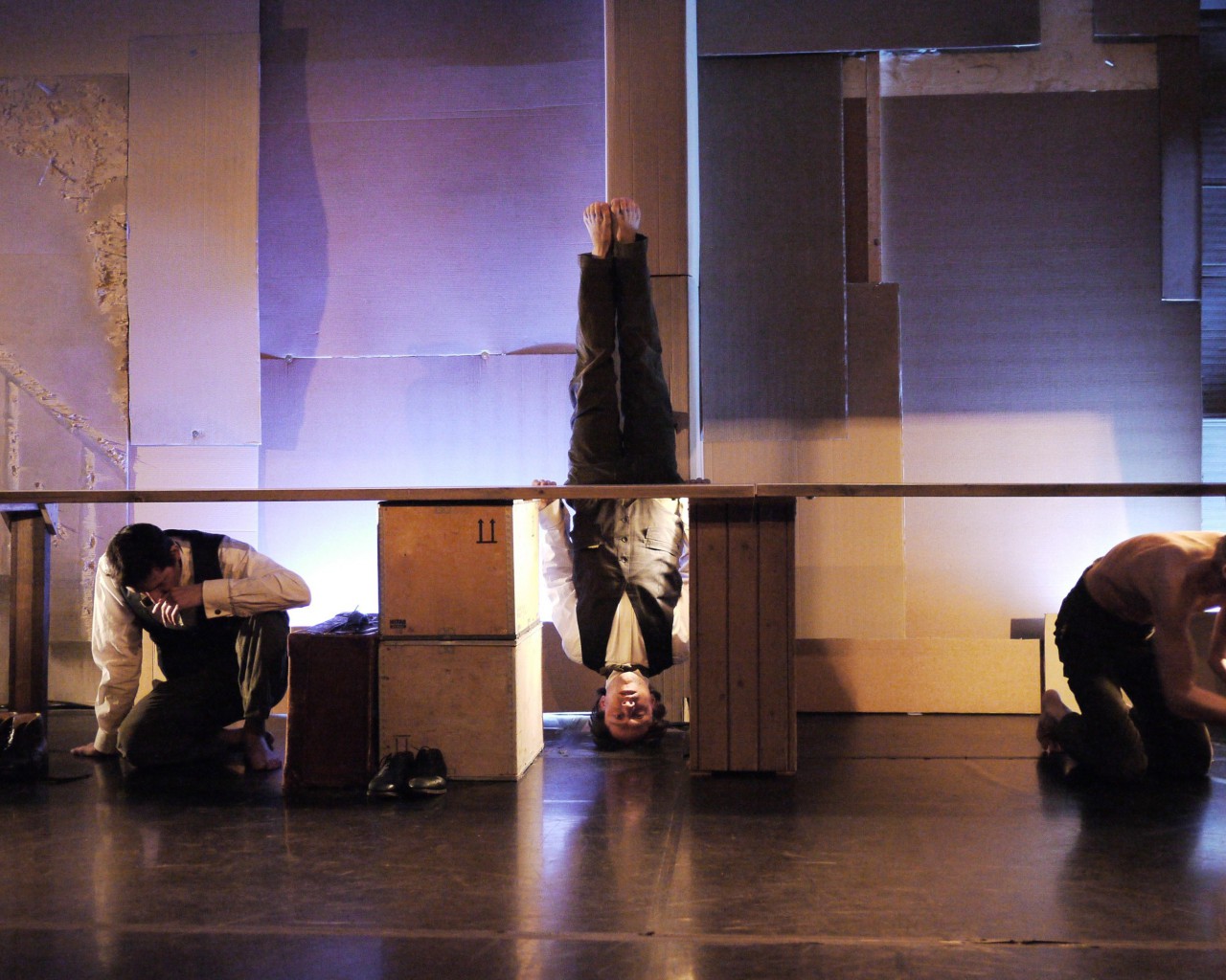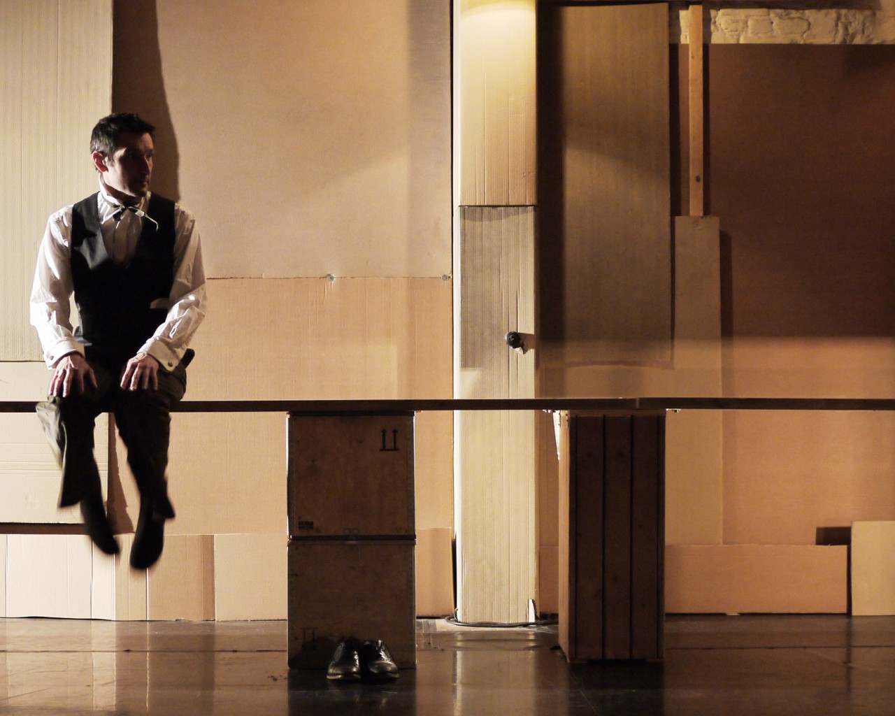 Le premier dialogue est tiré de plusieurs œuvres, le deuxième adopte la structure du roman La promenade (1917). Il reste néanmoins inracontable, fait de touches légères, de rencontres, de réflexions, conçu pour le regard autant que pour l’écoute, nourri de silences, d’arrêts, de mouvements au ralenti dans une chorégraphie incomparable, nuancé par une utilisation subtile des lumières, usant d’accessoires de carton – cadres, parois fragiles – posés avec précision, là où il faut, quand il le faut, pour définir l’espace. Des « arrêts sur image », éclairés de jaune, évoquent de vieux daguerréotypes ; une chevelure sauvage rappelle les masques populaires suisses. L’ensemble compose un spectacle poétique d’une grande beauté. […]