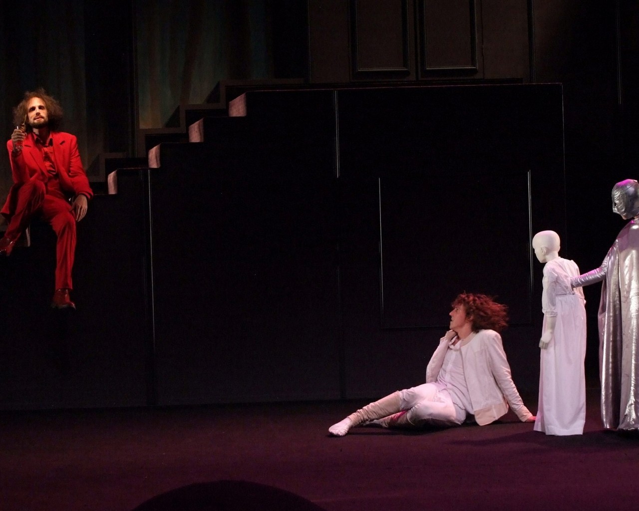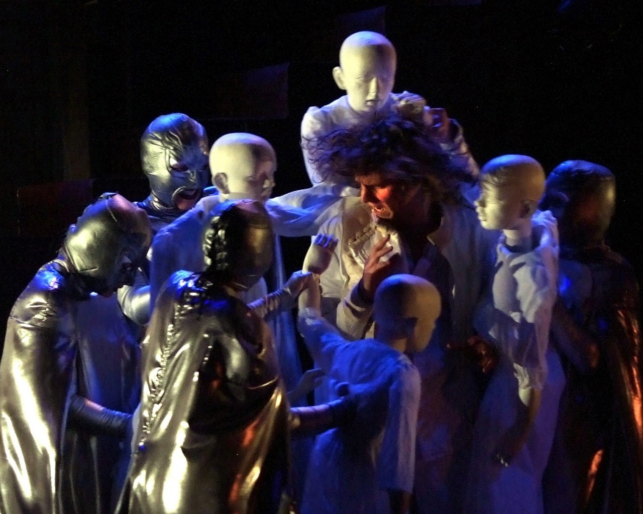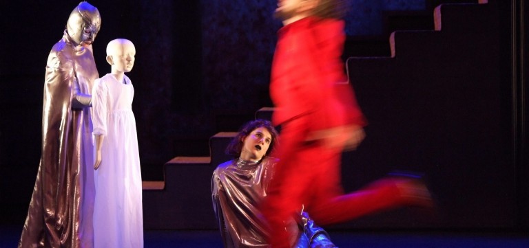 Un texte pas simple et une histoire étrange que celle de Carine (Charlotte Villalonga, entre enfant et femme, la fragilité, la pureté incarnées), la jeune fille folle de son âme, de sa nuit de noces, de cet amour absolu plus divin qu'humain, qui l'habite pour Frédéric, un Damien De Dobbeleer, époustouflant, tout de passion, la confirmation d'un grand comédien. Autour d'eux, tous saccagent à leur manière, la pureté, le désir de Carine, tentant de lui ouvrir les yeux, de lui faire quitter ses cimes pour se cogner à la réalité de la vie, à sa cruauté. Et les deux adolescents n'y résisteront pas, Troublante métaphore : la chasse dont le son des cors ouvre la pièce sonne aussi l'hallali de la pureté, manipulé par « le chasseur », Itzik Elbaz, des plus ambigus, être étrange sans illusions, et oncle de la jeune fille. Et l'on devine qu'entre les adultes, blessés eux aussi, entre la mère (Anne-Claire, dans une superbe composition violente et désespérée) et son amant, se sont tramés d'inavouables désirs coupables. Les mascarades danseront ici des bacchanales, comme souvent chez Crommelynck, dominos noirs et argent, glaçantes grandes marionnettes portées, blanches... « foule hostile, souvenir aux mille visages », crées par Bernard Clair.