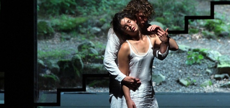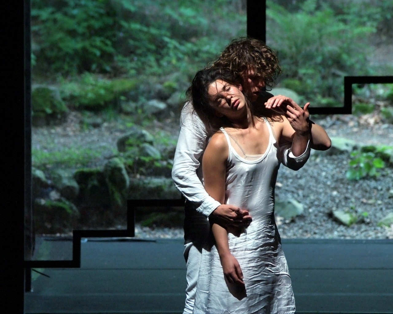 L'écriture de La Jeune Fille folle de son âme est d'une autre veine, plus sombre et dramatique, mais totalement fascinante, s'étirant entre images lyriques et un verbe cru très audacieux pour son époque, 1929. Elle s'incarne dans le corps des acteurs (six professionnels et une dizaine d'amateurs) qui sont appelés au dépassement et à l'incandescence dans leur jeu. Le fil conducteur de la narration se tisse autour de la longue nuit de noces d'un jeune couple qui se déroule dans la chambre d'un château, érigé sur un parc. Un écrin tout trouvé pour le public de Bussang, dont l'une des grandes attentes est l'ouverture du fond de scène sur la forêt vosgienne, comme rituel et point d'orgue de la représentation. Carine (Charlotte Villalonga) a passé cinq ans au couvent séparée de Frédéric (Damien De Dobbeleer). Son oncle (Itsik Elbaz), propriétaire du château, organise pour le soir des noces un bal masqué où les couples invités vont se défaire et se recomposer, dessinant une géographie complexe du désir qui va de la découverte libre et joyeuse à la manipulation perverse. Inexorablement, le destin des amants va basculer vers le tragique. Si les trois comédiens portent avec fougue et brio, chacun dans leur singularité, cette langue charnelle, on est plus dubitatif devant le parti pris des personnages masqués, qui semblent corsetés et dont on cherche en vain la sensualité et la subversion.