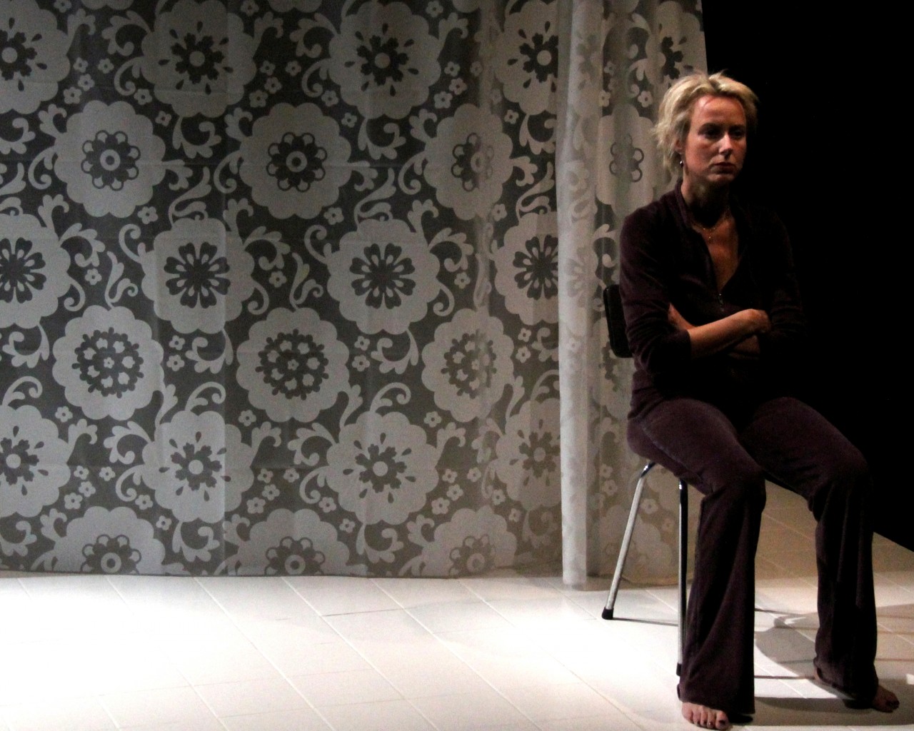 Le décor est aussi sobre qu'efficace : un carrelage de salle de bain, une chaise rudimentaire et un rideau de douche plastifié. [...]