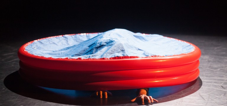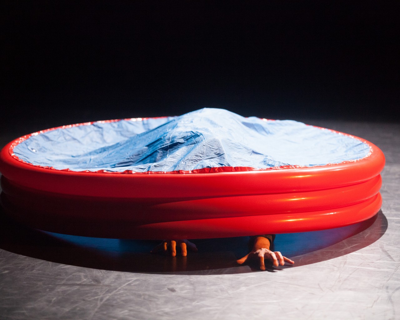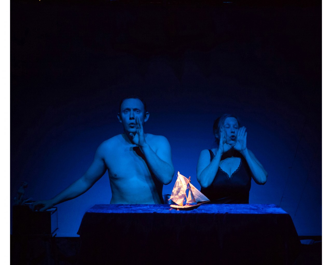 Au milieu de la scène, une piscine. Dans la piscine : pas d’eau, mais une drôle de fable amoureuse ! Celle d’un capitaine en retraite qui demande la mer en mariage. Comme c’est la première fois qu’on l’invite à sortir, la mer accepte la demande. Elle prend sa retraite elle aussi, et se coule dans un verre d’eau. Ils s’installent ensemble dans un appartement et se racontent… Seulement un monde sans la mer, ce n’est plus que du vent…